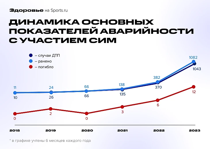 По итогам первого полугодия 2023 года в России было зафиксировано 1043 ДТП с участием электросамокатов и других СИМ: почти в три раза больше, чем за аналогичный период прошлого года. В ДТП ранения получили 1082 человека, в том числе 432 ребенка младше 16 лет. Погибло 12 человек, включая одного ребенка. Смертность всего за год выросла в два раза, а травматизм – почти в три!