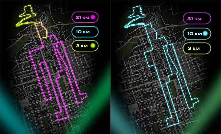 Трасса освещена уличными фонарями, дополнительно каждому участнику в стартовом пакете выдают налобный фонарик для лучшей видимости и украшения забега.