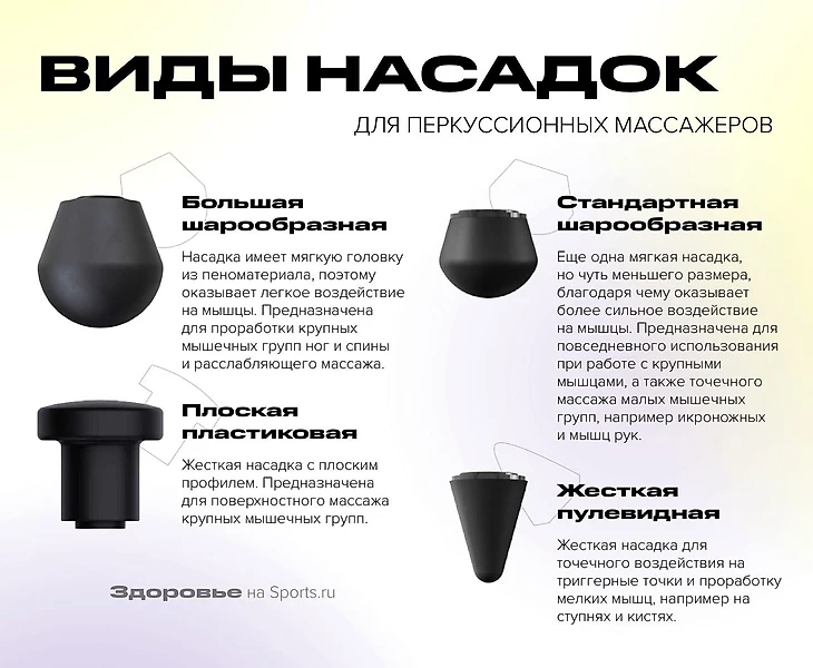6. Разнообразие насадок. Некоторые пистолеты изначально комплектуются набором сменных насадок (стандартная шарообразная из мягкой резины, плоская пластиковая, пулевидная), но бывают массажеры только с одной насадкой. Важно отметить, что даже у одного производителя насадки от разных моделей могут быть не совместимы. Уточняйте этот момент до покупки, а также ассортимент доступных насадок для конкретной модели.