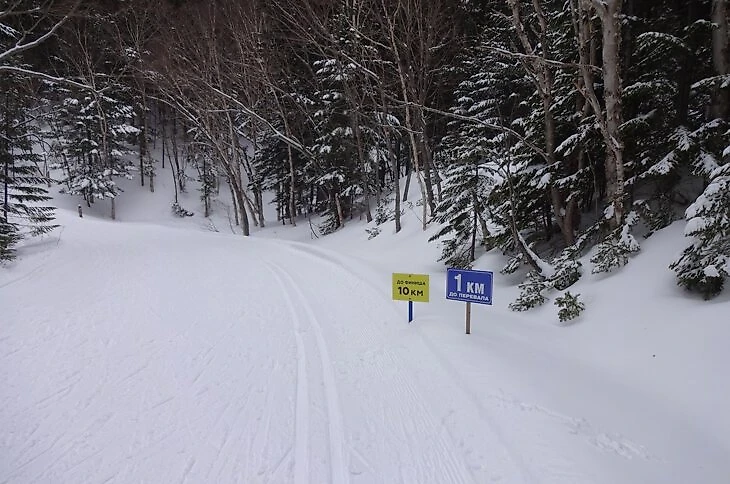 Любуюсь периодически красотами сахалинской природы. Отмечаю, что такую природу видел, к примеру, в Изерских горах в Чехии на марафоне «Чизерка». После 30-го километра попадается на глаза табличка «До конца перевала 7 км». Начался набор высоты. Сплошного подъема в 7 км в моей практике никогда не было. Был трехкилометровый финишный подъем на лыжном марафоне «Марчалонга» в Италии. Но это было практически 10 лет назад. Тогда я зашел в него из принципа на руках, проехав мимо смазчиков и не потеряв скольжения. Но перевал Чехова предстояло пройти свободным стилем, по разбитой и мягкой трассе, да и старше я стал на 10 лет.