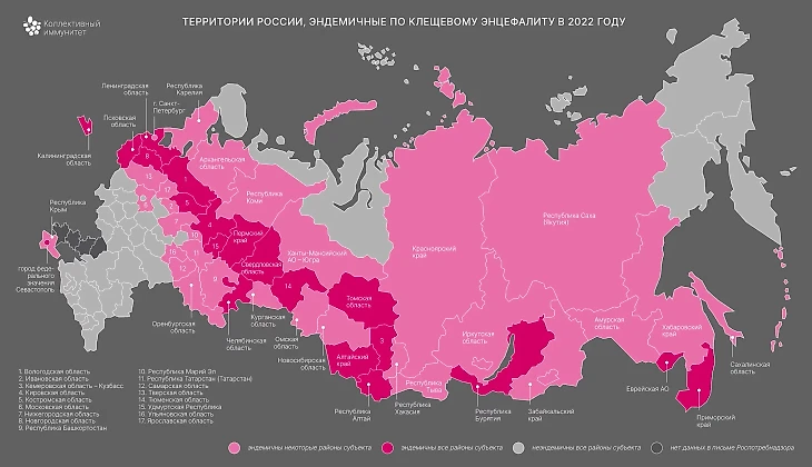 Узнать, насколько опасны клещи в конкретном регионе, можно на интерактивной карте (карту составляли на основе официального письма Роспотребнадзора от 24 мая 2023 года. Данные обновляются ежегодно).