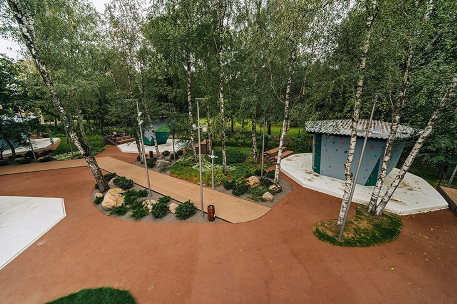 Здесь располагается несколько «грибов» с трассами разной сложности и под разным уклоном, есть валун с естественным рельефом. Посреди локации высится 16-метровый скалодром для лазания с верхней страховкой.
