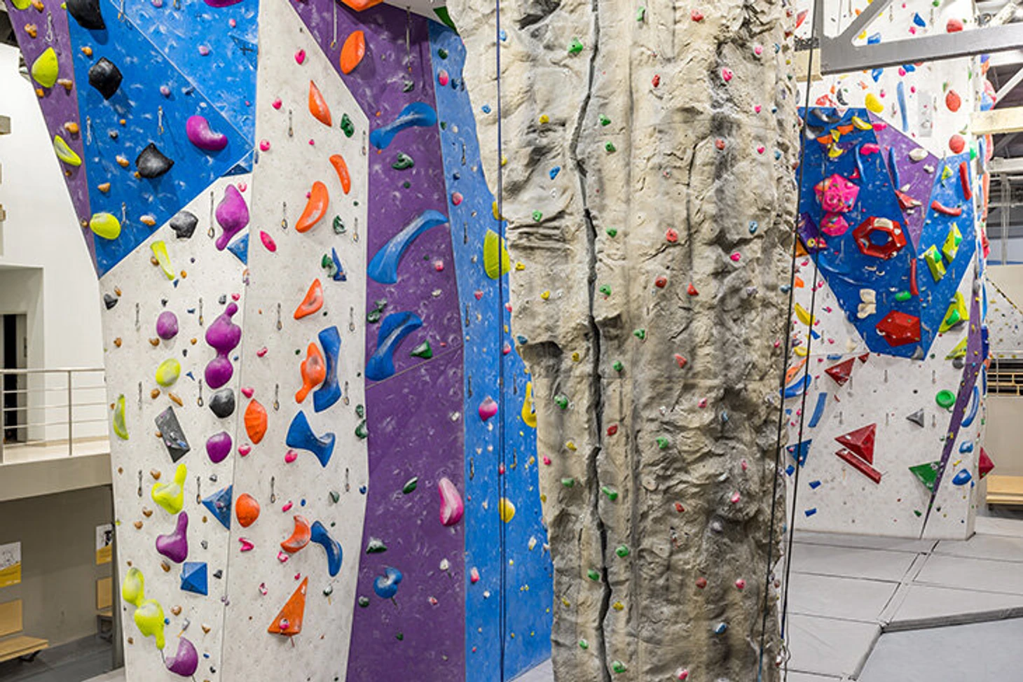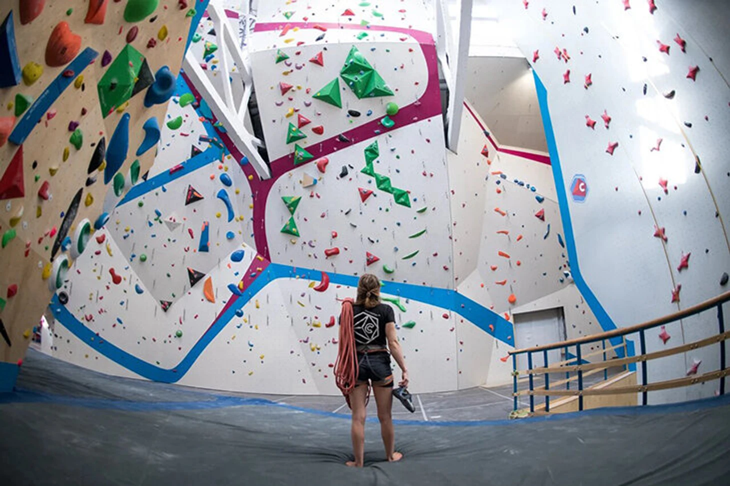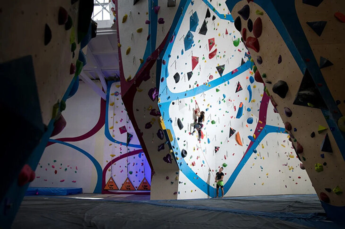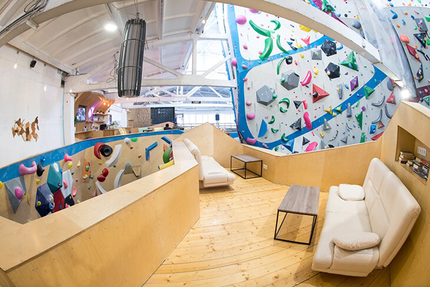 Зал для боулдеринга занимает площадь 300 м². Стены образуют коридоры, по которым можно пройти и увидеть скалолазов сверху. А значит, сделать классные фотографии. Высота стены для трудности – 13,5 м, площадь – 750 м². 2 скоростные трассы высотой 15 метров находятся в том же пространстве.