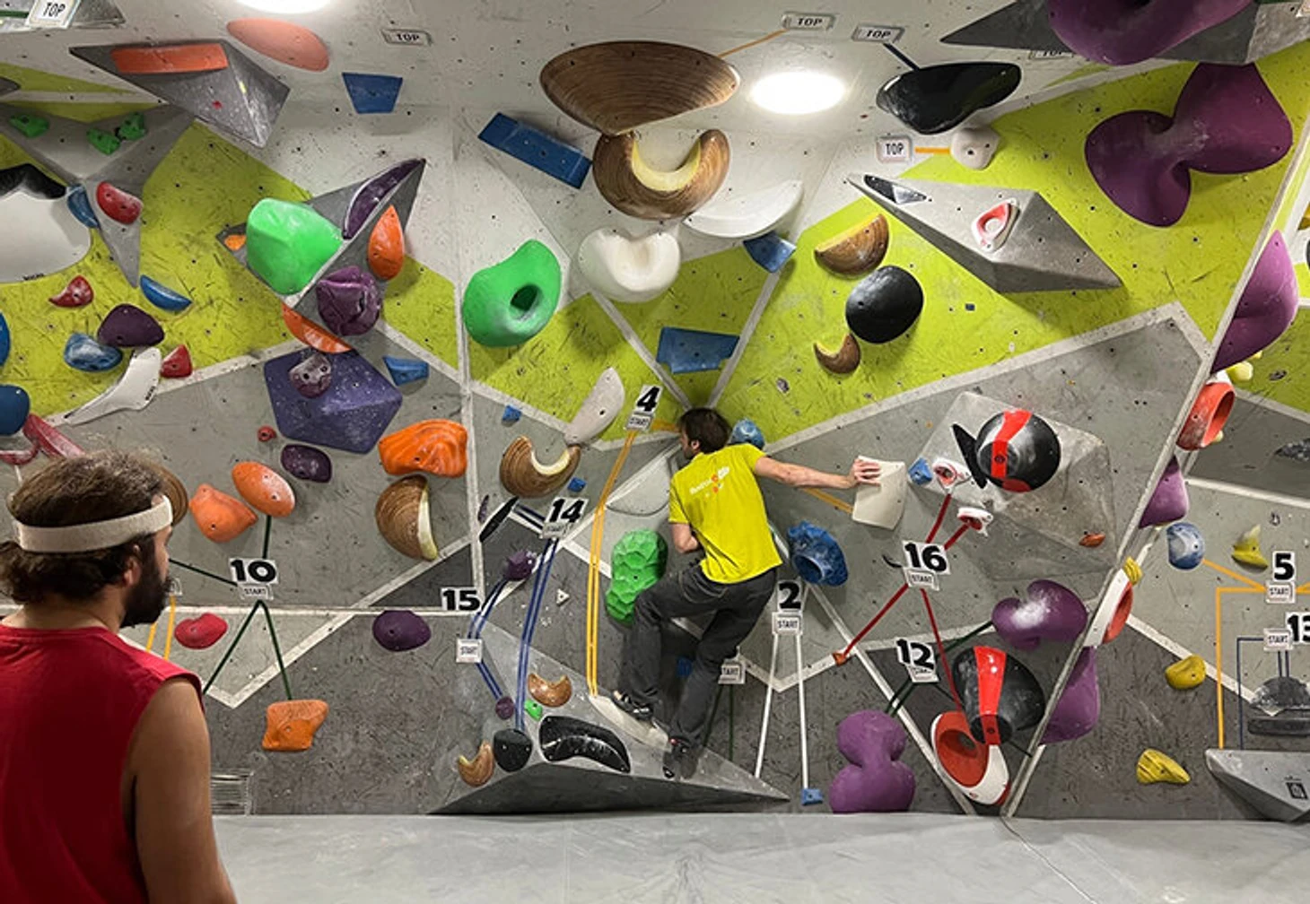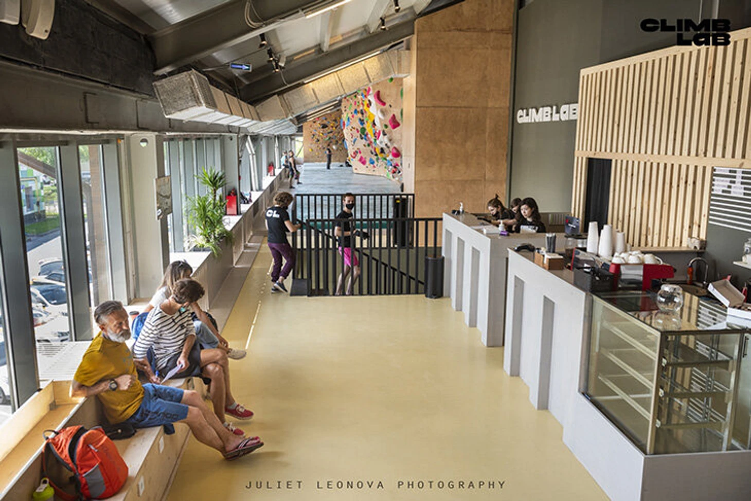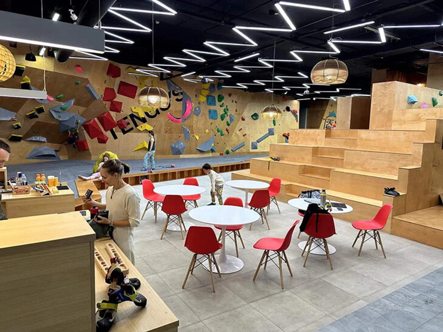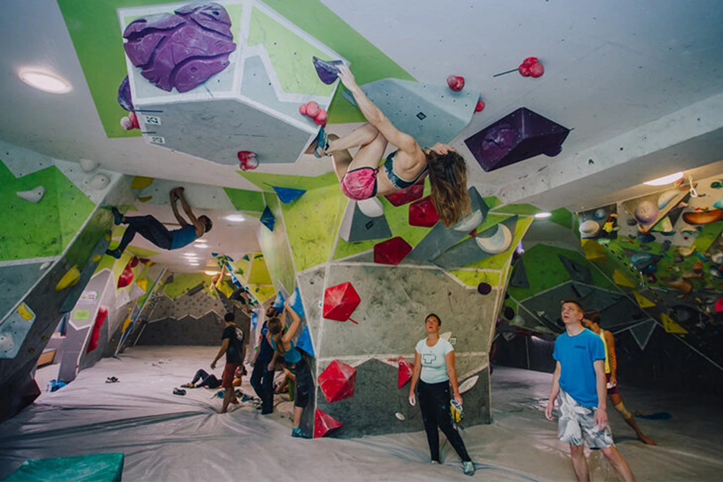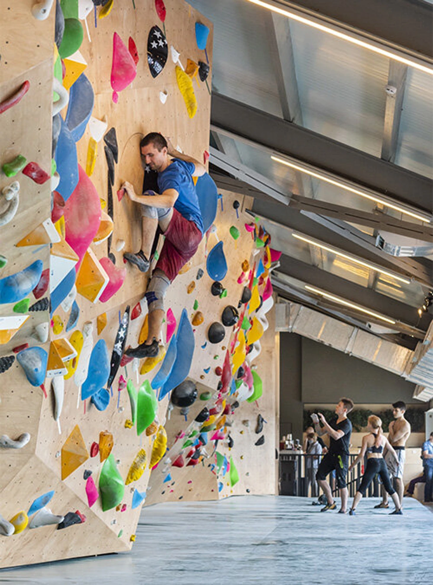 Зал для боулдеринга занимает площадь 300 м². Стены образуют коридоры, по которым можно пройти и увидеть скалолазов сверху. А значит, сделать классные фотографии. Высота стены для трудности – 13,5 м, площадь – 750 м². 2 скоростные трассы высотой 15 метров находятся в том же пространстве.