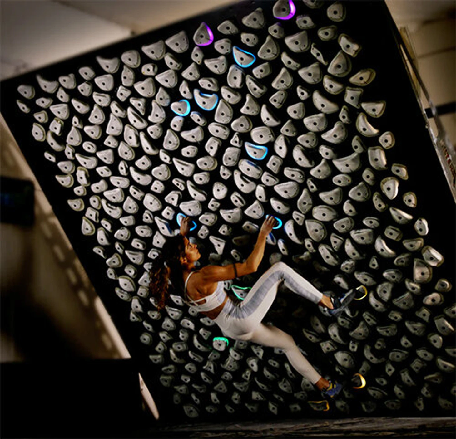 На скалодроме есть интересный и довольно редкий для российских скалодромов тренажер – килтерборд. Это тренажер в виде отвесной стены с тысячами вариантами боулдеринговых раскладов. На нем есть зацепы самых разных хватов, а угол наклона стены регулируется. Включать разные трассы на килтерборде можно через приложение Kilter Board, а зацепы будут подсвечиваться светодиодами, показывая маршрут. На скалодроме Bigwall представлена новейшая версия этого тренажера, 2023 года.