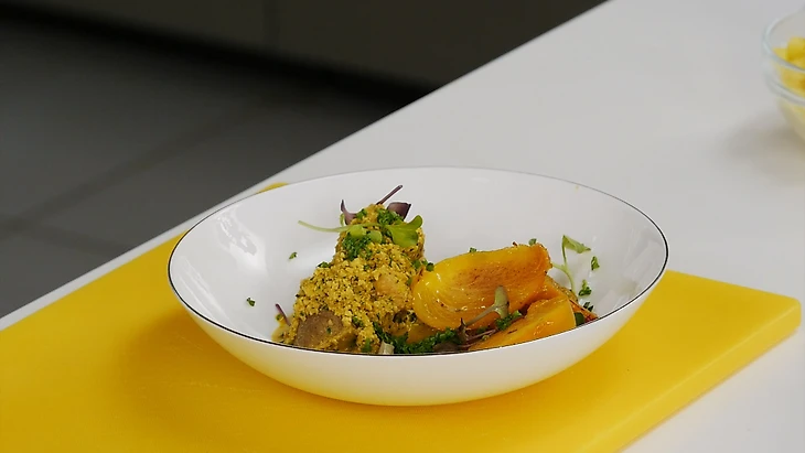 Сациви – национальное блюдо грузинской кухни. Предлагаем попробовать приготовить его с добавлением кураги и свежей хурмы.