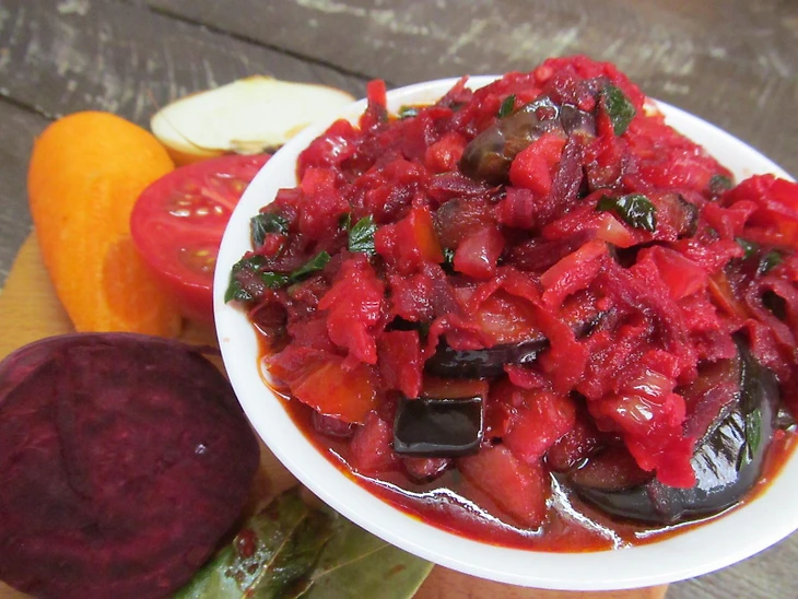 Для приготовления блюда понадобится 2 баклажана, 1 крупная свекла, 1 луковица, 2 зубчика чеснока, соль, перец по вкусу. Обжаривать овощи можно на подсолнечном, оливковом или сливочном масле.
