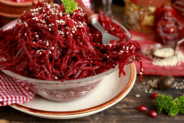 Свеклу можно использовать сырую или довести ее до полуготовности, отварив в течение 10-15 минут. Во втором случае салат будет более мягким. Свеклу натереть на корейской терке или нарезать соломкой, измельчить перец и чеснок. На сковороде с разогретым маслом обжарить чеснок, перец и кориандр, достаточно 5-10 секунд. Готовую смесь сразу вылить в емкость с тертой свеклой и перемешать. Для подачи салат можно посыпать обжаренным кунжутом и добавить немного зелени.