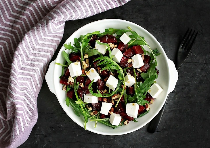 Для приготовления салата понадобится 400 грамм свеклы, фета 200-250 грамм, листья салата, петрушка и грецкие орехи. В состав заправки входят оливковое масло 3 ст. л., лимонный сок 2 ст. л., чеснок 2 зубчика, горчица 1 ч. л, соль и перец по вкусу.