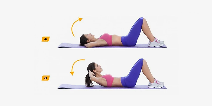Лежа на спине согните ноги, поставьте стопы ближе к ягодицам, руки скрестите за головой.