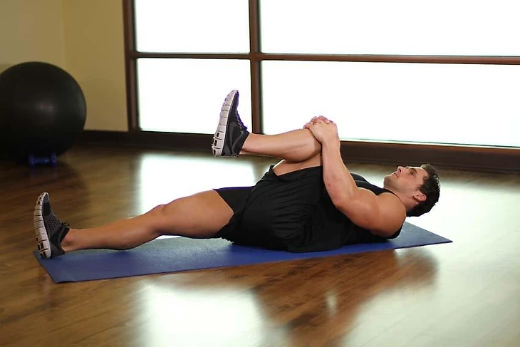 Придерживайте ногу у груди 5-7 секунд и верните ее в исходное положение. Повторите с другим коленом.