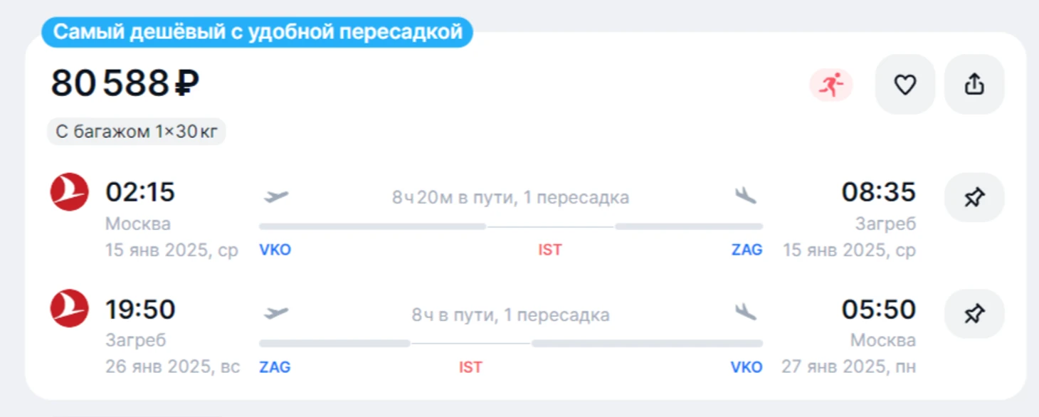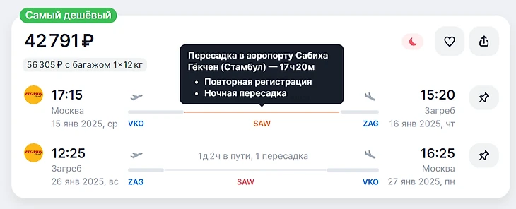 Самый дешевый (около 43 тыс. в обе стороны на середину января 2025 г.), но и самый длинный перелет (более суток) будет проходить через Стамбул.