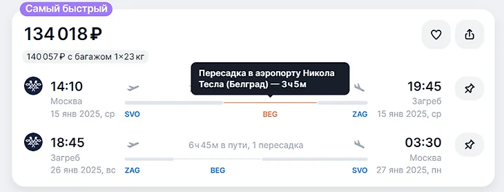 Самый быстрый рейс проходит с пересадкой в Белграде и обойдется в 134 тыс. руб.