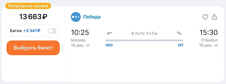 Турция – одна из стран, которая сохраняет прямое авиасообщение с Россией. Регулярные рейсы действуют из аэропортов Москвы, Санкт-Петербурга, Екатеринбурга, Новосибирска и других городов страны. Например Победой можно добраться из Москвы в Стамбул за тринадцать тысяч.
