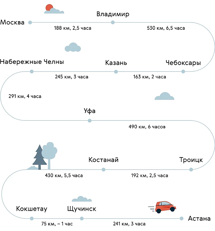 Дорога от Москвы до Астаны занимает полтора дня или 2870 километров. Расходы на проезд на своем авто сравнимы с перелетом, однако вы экономите на провозе багажа и по дороге сможете остановится в любом понравившемся месте.