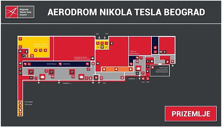 Также около терминалов дежурят таксисты, которые довезут до центра за 20 минут. Туристам следует соблюдать осторожность и пользоваться услугами только лицензированных автомоторных таксомоторных компаний. Если заблудились, обратитесь за помощью к охране или администрации, а также изучите схему расположения транзитной зоны аэропорта Белграда.