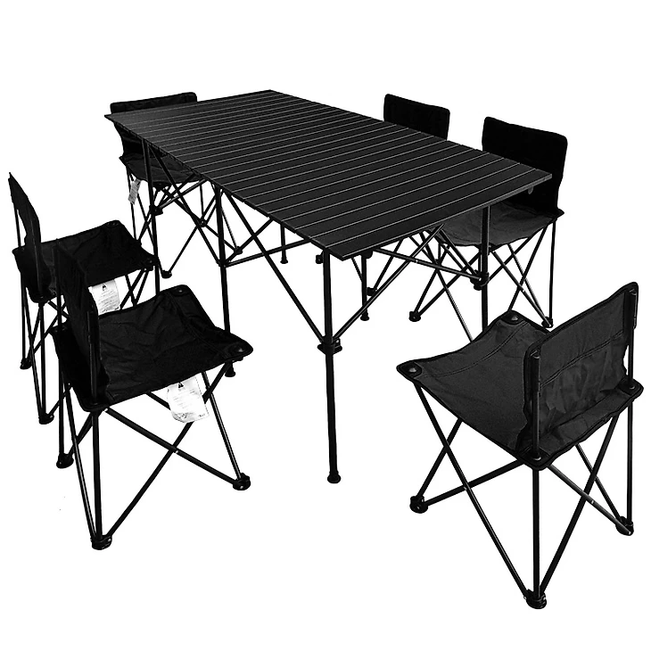 На Алиэкспресс примерно за 5000 рублей можно приобрести складной туристический стол и четыре стула, которые также оснащены складным механизмом. Сиденье и спинка стульев выполнена из прочного брезента, а вот каркас и столешница – из алюминия. Немного изогнутые ножки придают столу дополнительную устойчивость.