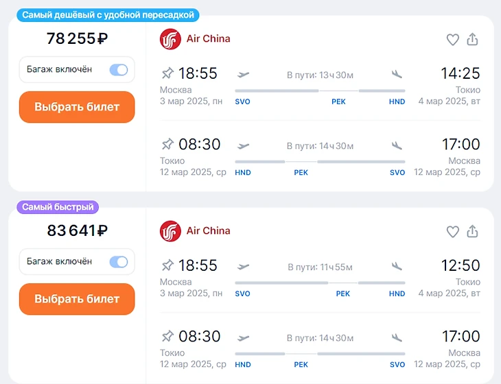 Прямых рейсов в Японию из России сейчас нет, но вы можете добраться до страны с пересадками в Пекине или Шанхае. Время в пути составляет от 11 ч. до 1 дня 8 ч., в зависимости от выбранного рейса и количества пересадок.