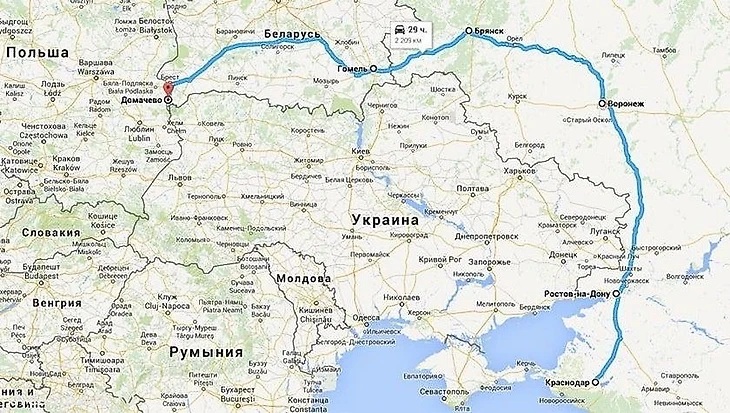 Из Беларуси. Протяженность пути составляет 1 805 км, время – 22 часа 27 минут. Маршрут проходит по трассе а/д Дон/Е115/М-4.