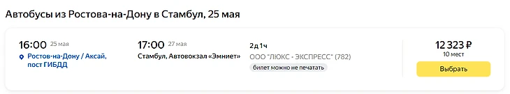 Также из Ростова-на-Дону в Стамбул отправляются автобусы российских перевозчиков. Есть рейсы в среду и субботу. Время в пути 2 дня и 1 час, стоимость проезда от 12 000 рублей.