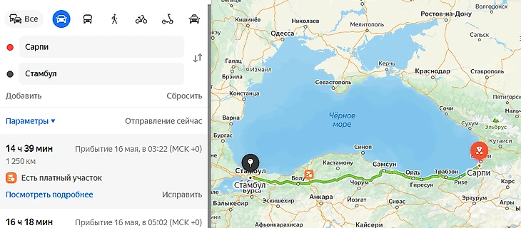 До 2018 года Сочи и Трабзон соединяла паромная переправа, которая в 2025 году не работает. Время в пути занимало 12-18 часов и не было проблем с транзитными странами.