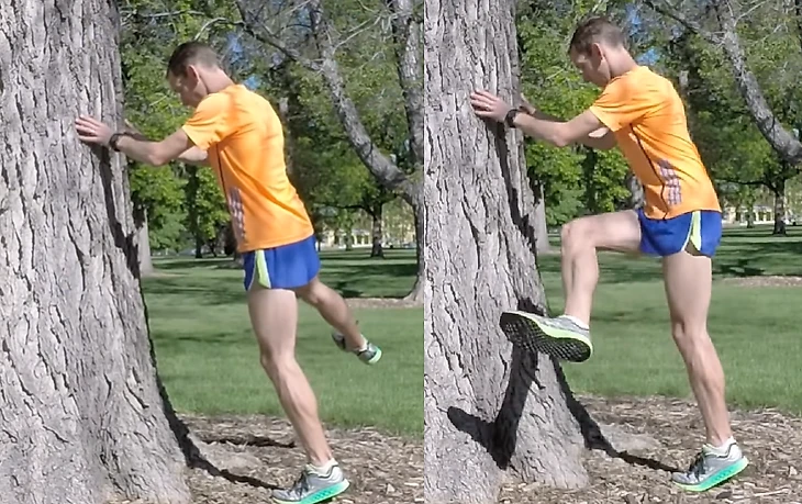 Найдите опору – например, дерево или стену, положите на нее ладони и привстаньте на мыски. Затем начните выполнять маховые движения правой и левой ногами поочередно.