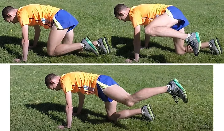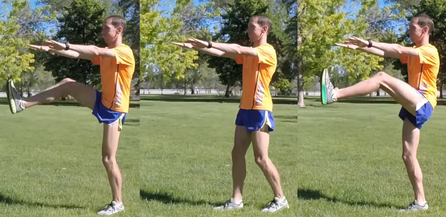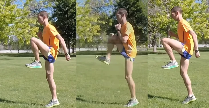 В движении сделайте небольшой прыжок и потяните колено к груди. Приземлитесь на переднюю или среднюю часть стопы, избегайте ударяться пяткой. Повторите то же самое с другой ногой, продолжая движение.