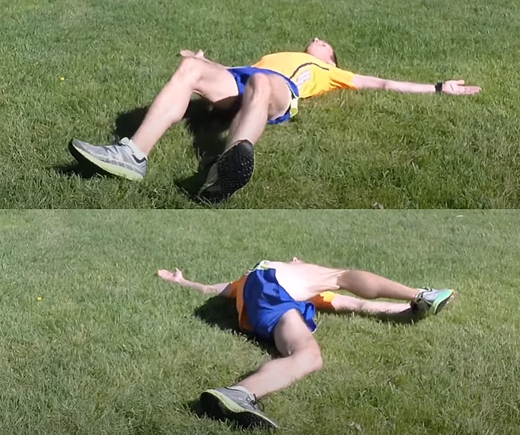 Лягте на спину с широко раскинутыми руками и прижмите плечи к земле, ноги расставлять не нужно. Сделайте мах левой ногой – к правой ладони, а затем мах правой ногой – к левой ладони. Во время упражнения можно поднимать таз и держать колени слегка согнутыми.