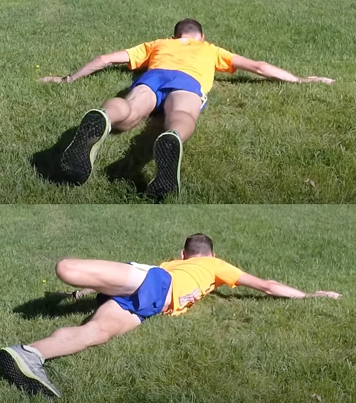 Лягте на живот и расставьте руки в стороны. Начните, как и в прошлом упражнении, выполнять махи ногами к противоположной руке. Грудь должна быть прижата к земле, а вот таз и корпус находятся в движении.