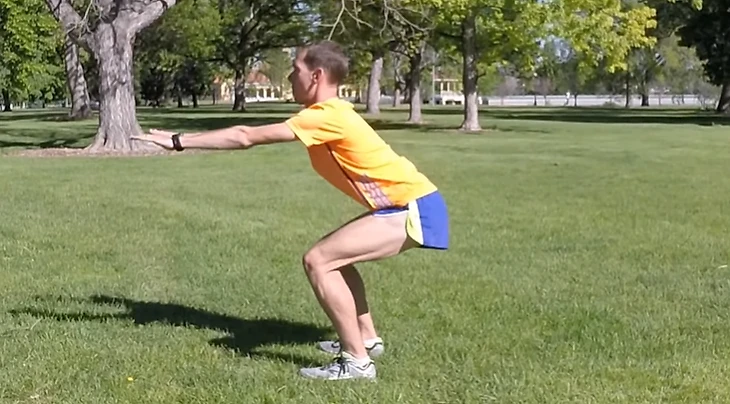 Поставьте ноги на ширине плеч и сделайте приседание. Оно должно быть глубоким настолько, чтобы бедра оставались параллельно земле. Руки можно вытянуть вперед, а носки должны смотреть прямо или слегка в стороны. Следите за тем, чтобы спина оставалась прямой.