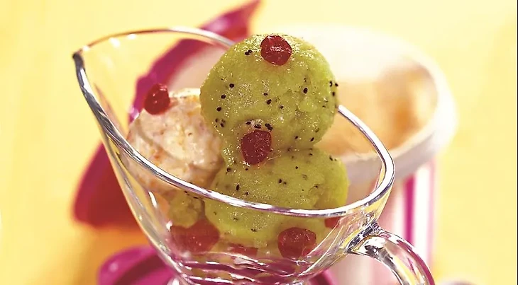 Приготовление: перемешайте сахар и воду. Кипятите, пока сахар не растворится. Уберите с огня и остудите. Смешайте сахарный сироп с пюре киви и лимонным соком. Вылейте смесь в контейнер и заморозьте на несколько часов. Каждые 30 минут перемешивайте смесь вилкой, чтобы разбить кристаллы льда. Подавайте киви-граните охлажденным.