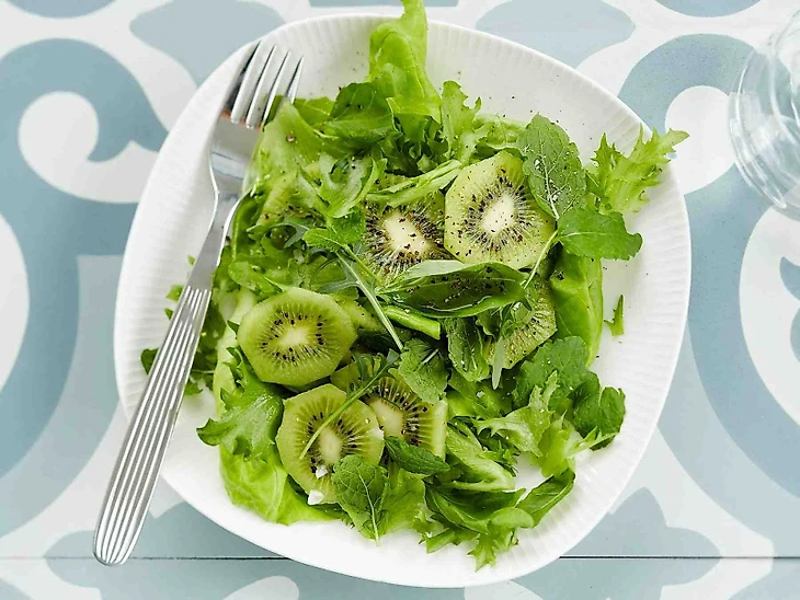 Состав: 2 киви без шкурки и кубиками, 100 г раскрошенной феты, 1/2 красного лука, 1/4 стакана свежей мяты, 2 стакана микса салатных листьев, 2 ст. л. оливкового масла, 1 ст. л. уксуса, соль и перец по вкусу.