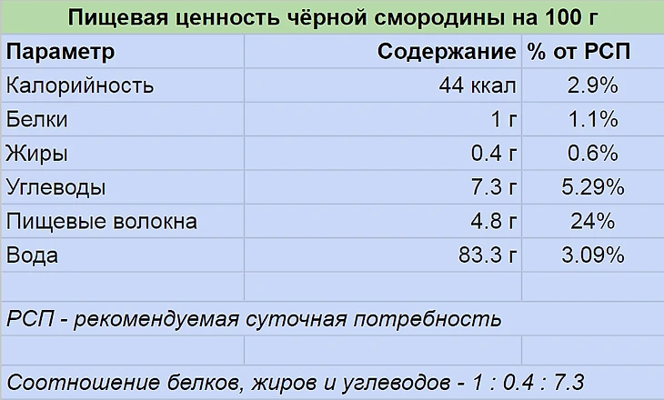 Приведем краткие сведения о пищевой ценности или КБЖУ (калорийность, белки, жиры и углеводы) на 100 г черной смородины. В таблице ниже указана доля веществ от рекомендуемой суточной потребности.