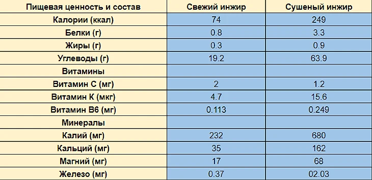Свежий имеет более нежную текстуру и менее концентрированный вкус. Сушеный слаще, калорийнее и содержит больше клетчатки и минералов на грамм веса. Свежий инжир богаче витамином С, который частично разрушается при сушке.