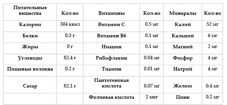 В 100 граммах меда содержится около 300-320 калорий. Несмотря на высокую калорийность, мед при умеренном употреблении не способствует набору веса из-за особенностей его усвоения организмом.