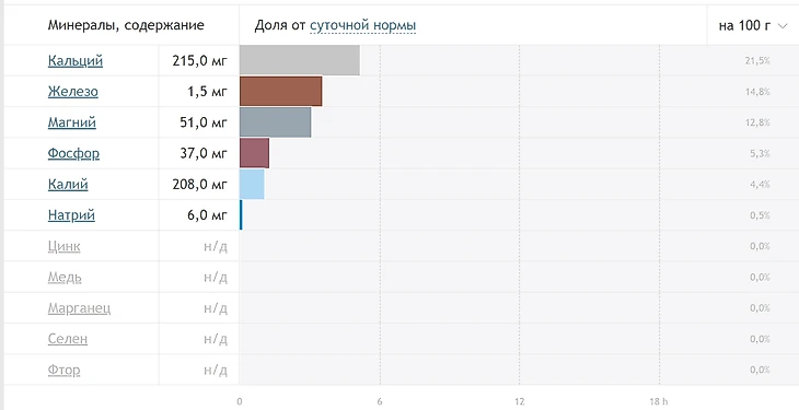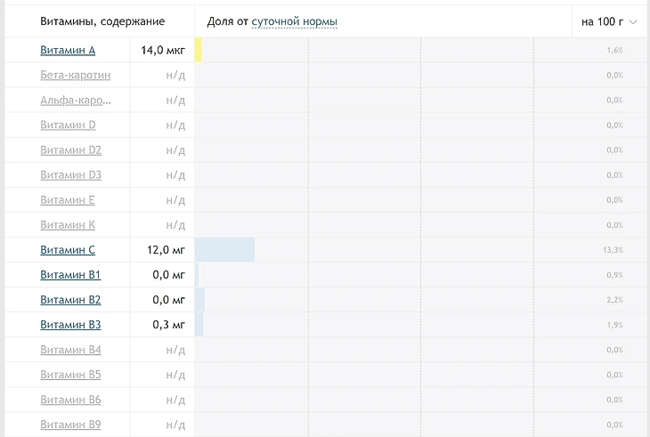 Ниже представлены витамины и их содержание в 100 граммах продукта.