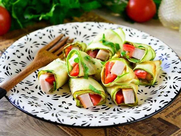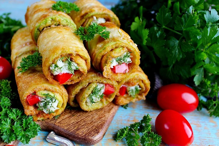 Выложите начинку на кабачки, добавьте ломтик помидора и базилик, сверните рулетиками.