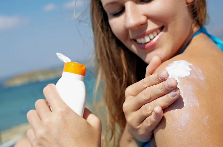 Перед выходом на солнце обрабатывайте незащищенные участки кожи солнцезащитным кремом. Минимальный фактор SPF 30, но лучше использовать SPF 50. Это защитит не только от солнечных ожогов, но и фотостарения кожи.