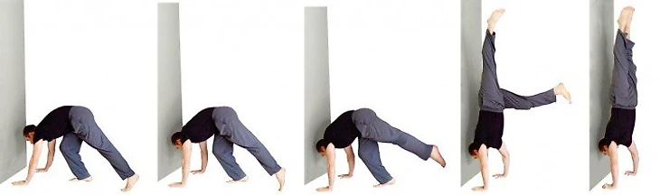Стойка у стены с ногами на стене: помогает привыкнуть к перевернутому положению, развивает силу и уверенность.
