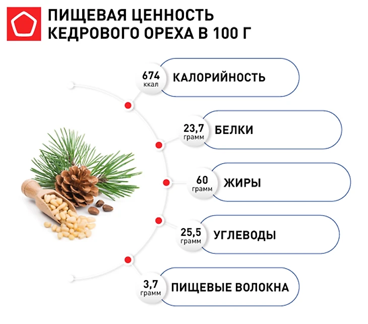 Кедровые орехи представляет собой семена кедровых сосен. Местом их выращивания считается Сибирь. Ценятся они за свои полезные свойства и богатый состав. Калорийность на 100 г. составляет 674 Ккал, белки — 23,7 г., жиры — 60 г., углеводы — 25,5 г.