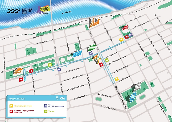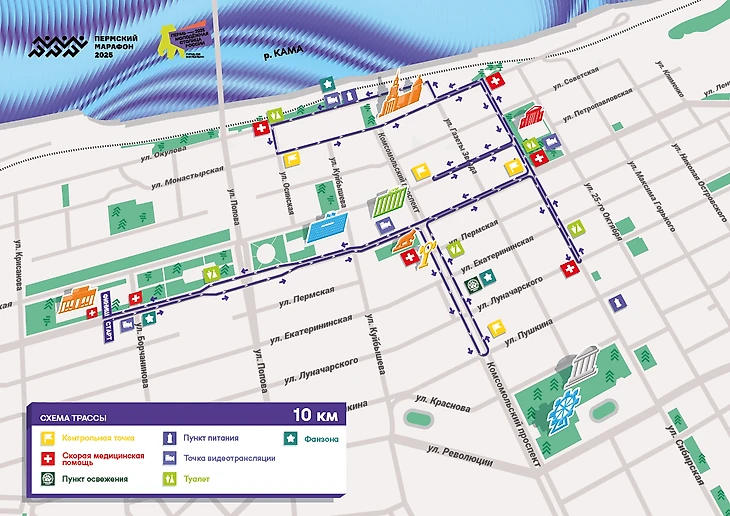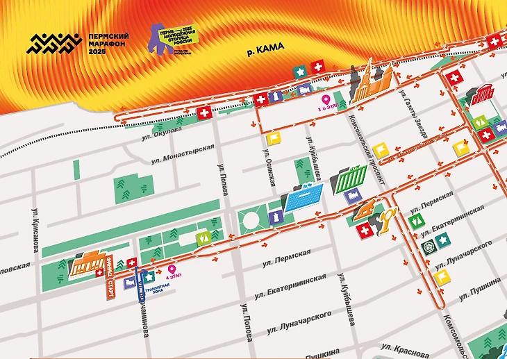 Марафонская трасса проходит в 2 круга по центру города: по улицам Ленина, Сибирской и Монастырской, а еще по Комсомольскому проспекту. Участники также пробегут вдоль реки Кама. Старт и финиш – на площади возле академического театра «Театр-Театр».