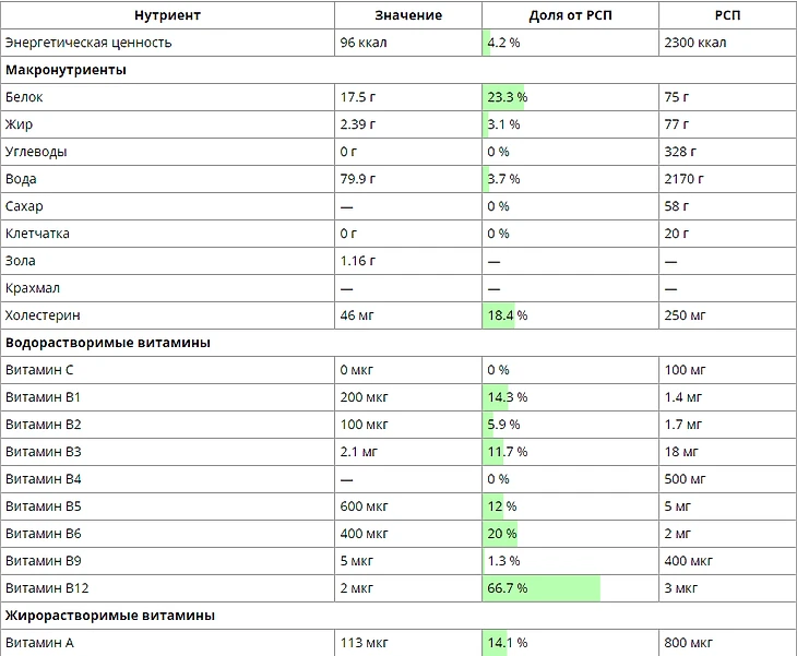 Мясо морского волка — прекрасный источник витаминов. На фото ниже представлен витаминный состав на 100 граммов рыбного филе.