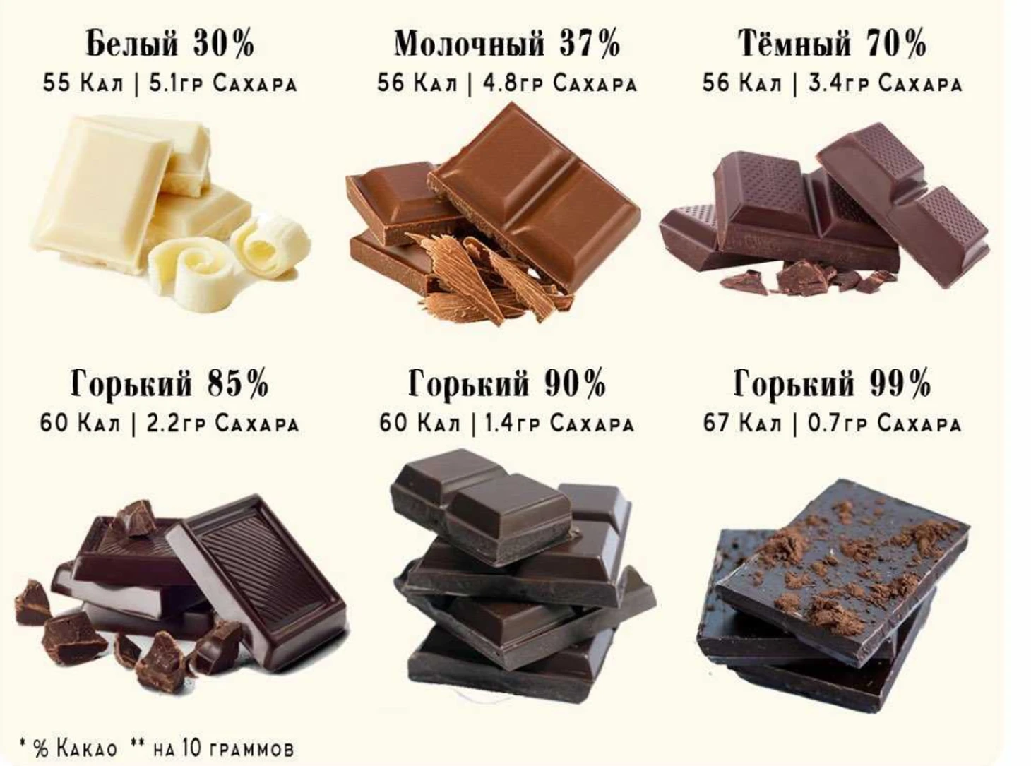 Чем ниже содержание какао-бобов в продукте, тем больше добавляется сахара или сахаросодержащих добавок. Темный, молочный и белый шоколад более калорийны.