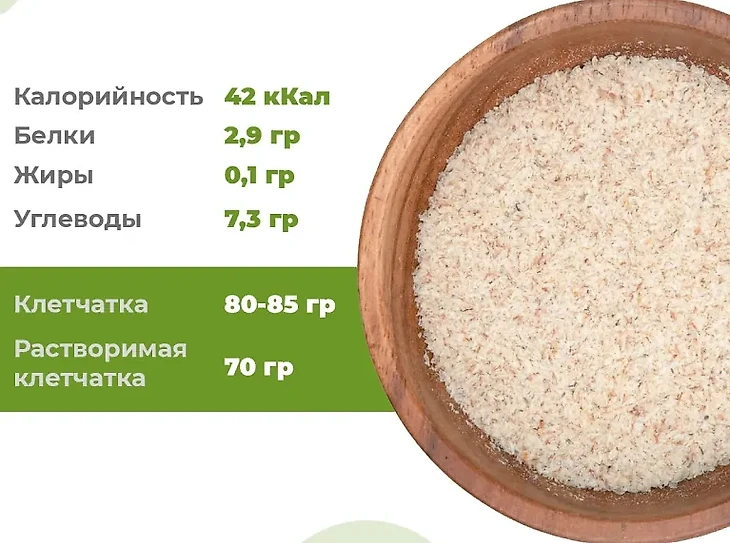 В 100 граммах продукта содержится до 87,8 граммов клетчатки. Калорийность псиллиума 17-42 ккал, так как пищевые волокна не перевариваются, поэтому продукт полезен во время диеты. В шелухе семян подорожника большое количество натрия, есть олеаноловая кислота, жирные масла, азотистые компоненты. В основном псиллиум выпускают в форме порошка или капсул с шелухой.