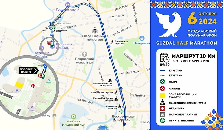 Старт и финиш находится на территории ГТК «Суздаль», а раздевалки и выдача номеров – там же, но в здании спортивного комплекса «Суздаль Арена» (ул. Коровники, 45).