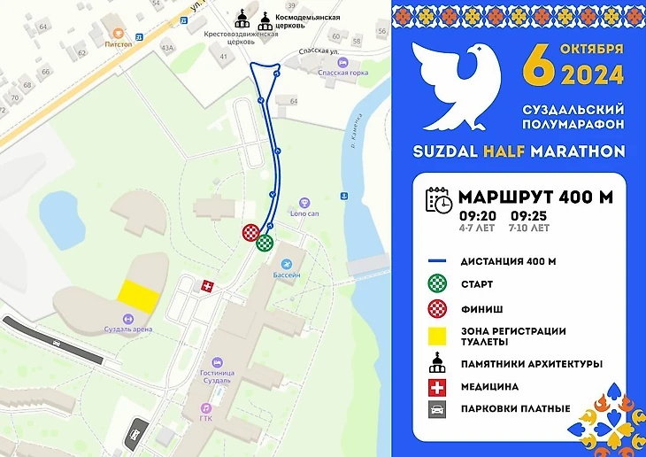 Если ехать целенаправленно на старт, то удобнее всего останавливаться прямо в гостиничном комплексе «Суздаль». Для участников забега гостиница дает скидку на проживание 7% по промокоду GZK2024. С этой скидкой номер для двух взрослых на одну ночь с 5 по 6 октября будет стоить 8 463 рубля (завтрак включен).