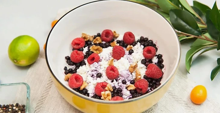 Перекус из творога с орехами и ягодами обеспечит потребление 30 мг витамина В4.