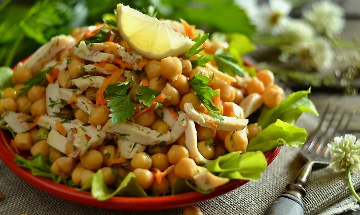 Салат с курицей и нутом обеспечит потребление 138 мг витамина В4.