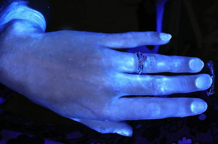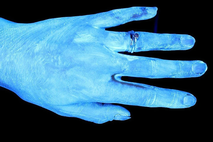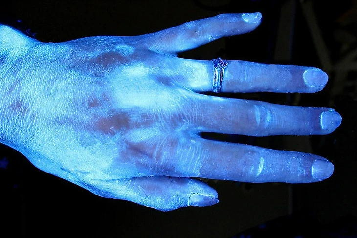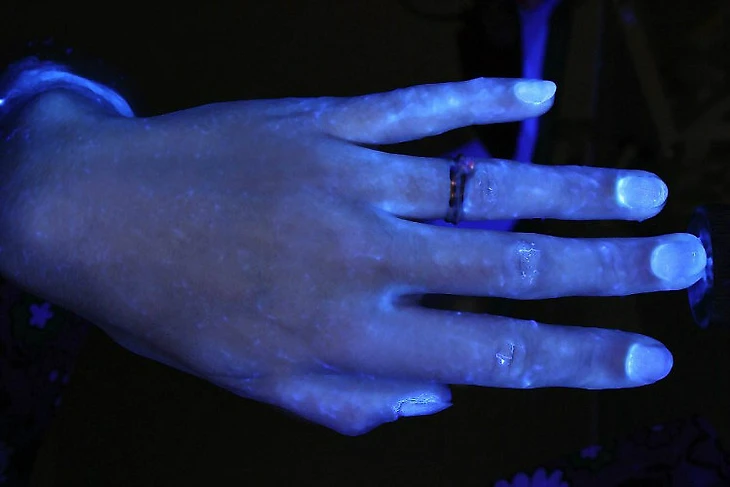 Ученые провели эксперимент, наглядно демонстрирующий, насколько сильно время мытья влияет на количество бактерий на руках. Для этого на руки нанесли специальный гель, который имитирует бактериальное обсеменение и светится при облучении ультрафиолетовым светом.