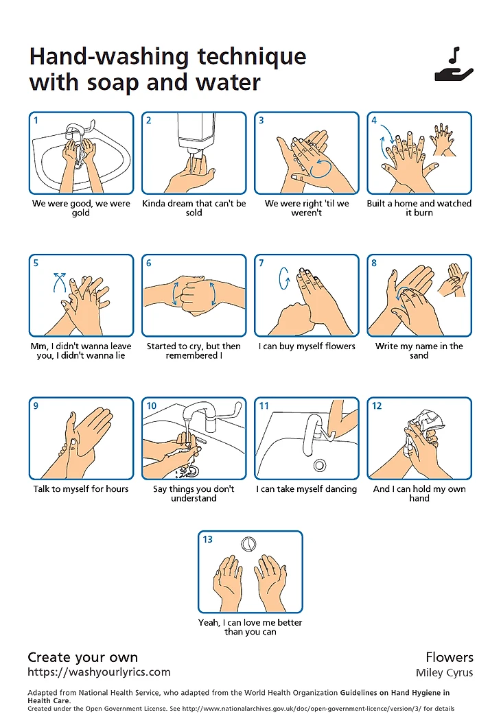 Чтобы не ошибиться со временем, можно 3–4 раза спеть Happy Birthday to You или воспользоваться сервисом Wash Your Lyrics. Он генерирует инструкцию для правильного мытья рук под тексты песен. Слова автоматически разбиваются на каждый шаг мытья так, чтобы человек успел тщательно очистить руки, пока подпевает.